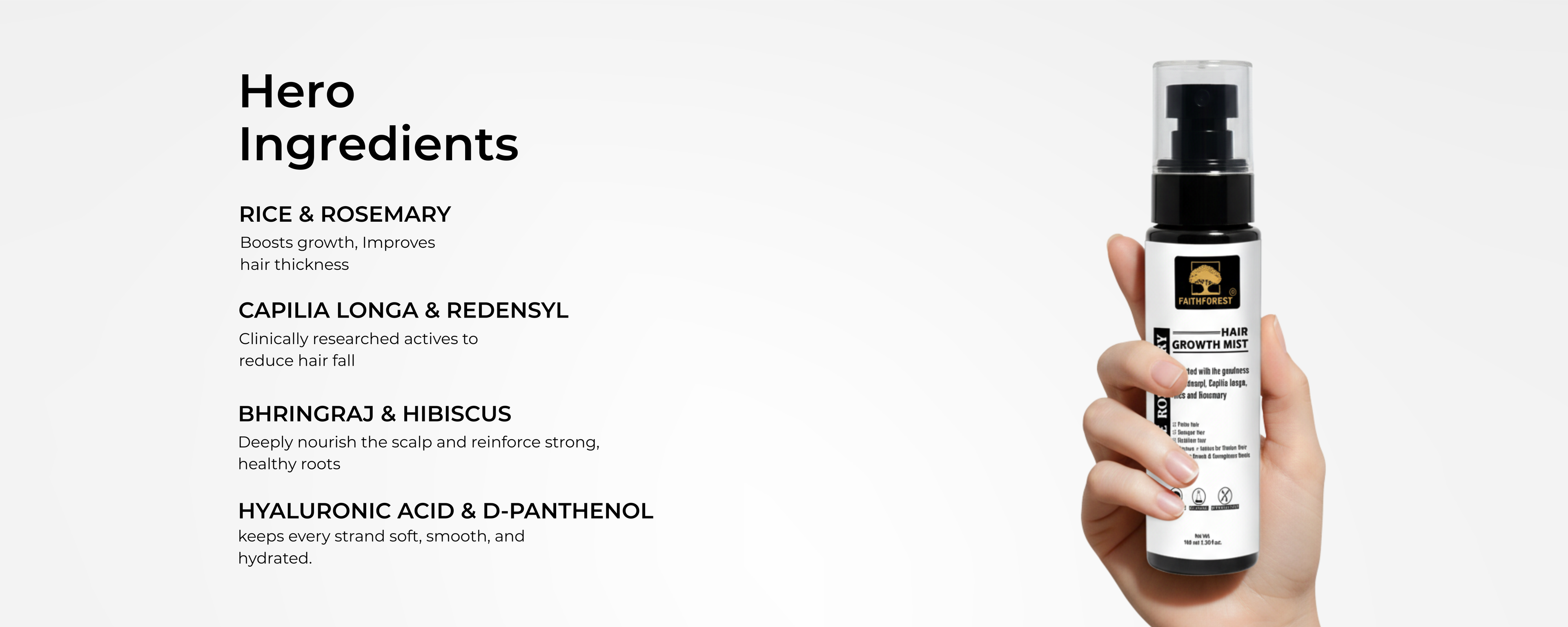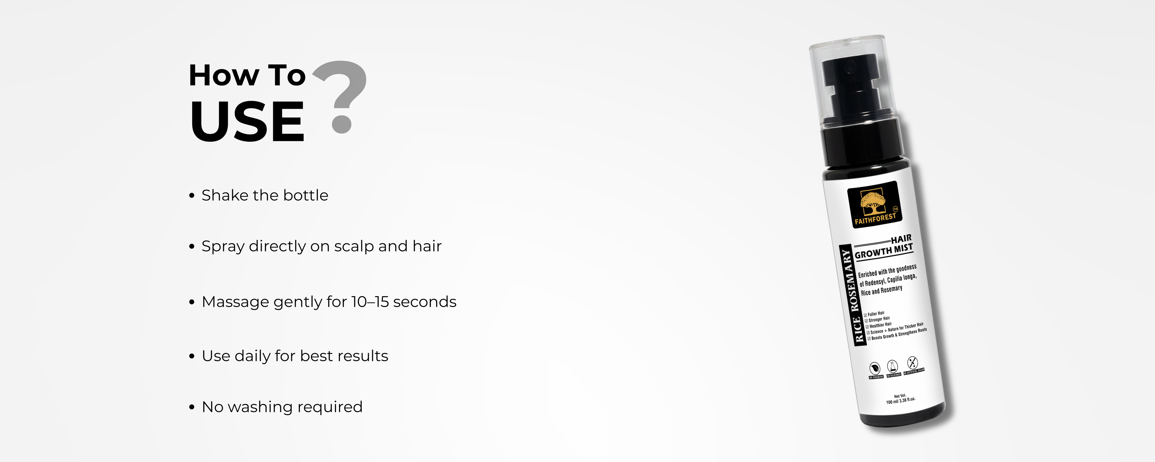 Tired of hair shedding and thinning? The FaithForest RICE ROSEMARY HAIR GROWTH MIST is an advanced, high-performance treatment that combines the wisdom of time-tested botanicals with clinically researched actives for visible results. This non-greasy mist is your daily secret to achieving visibly fuller, thicker, and healthier hair.