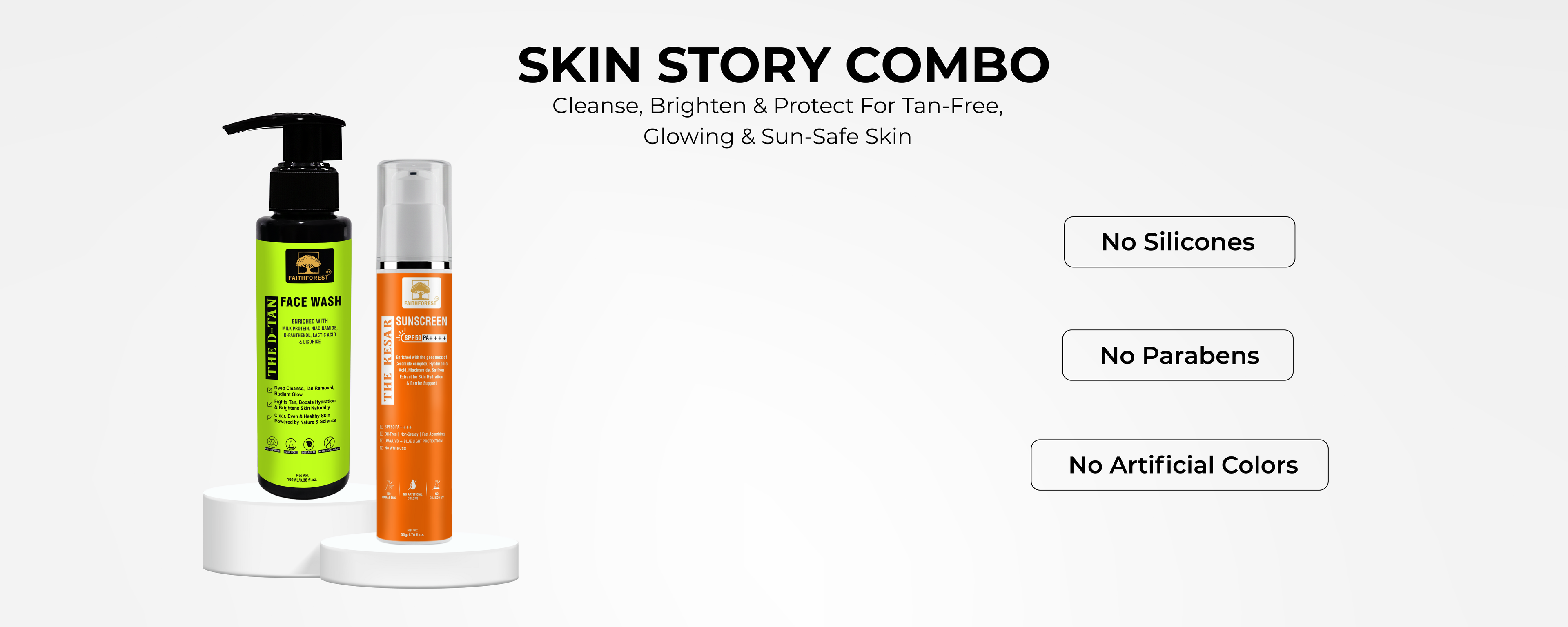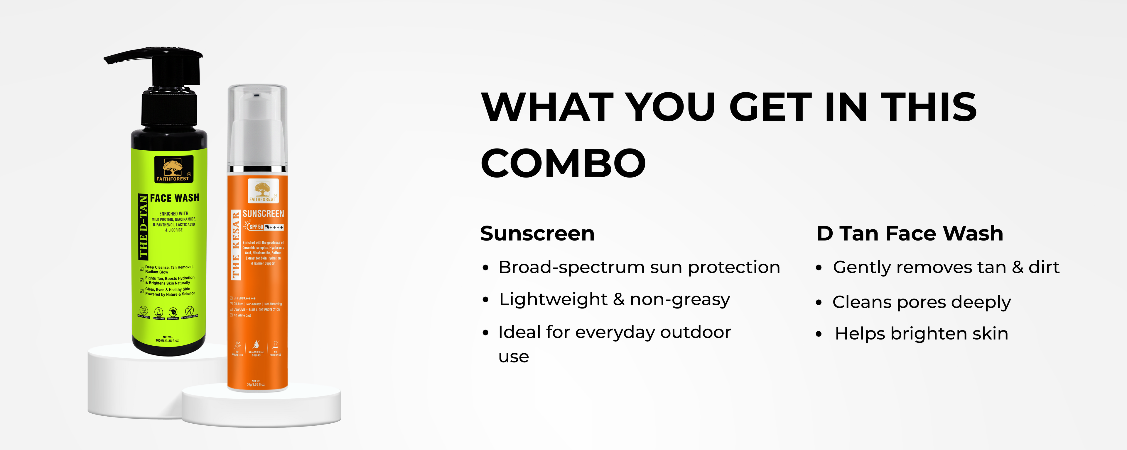 Defend your skin against tanning and sun damage while achieving a clear, radiant complexion with the FaithForest D-Tan & Sun Protection Combo. This essential duo combines the deep cleansing and tan-removal properties of The D-TAN Face Wash with the powerful broad-spectrum protection and Ayurvedic nourishment of The Kesar Sunscreen SPF 50 PA++++ for daily skincare perfection.