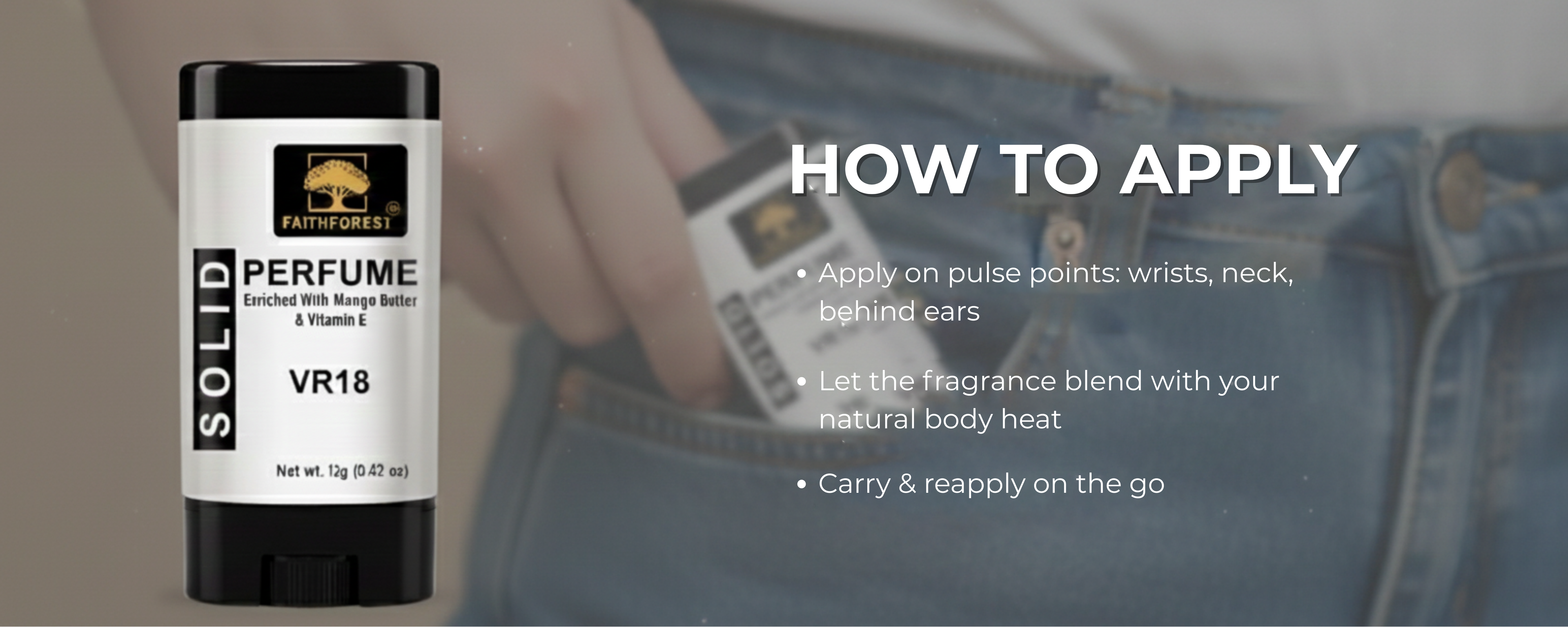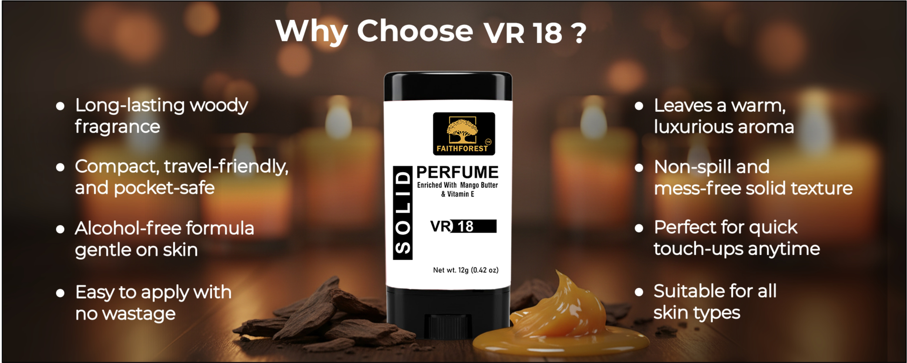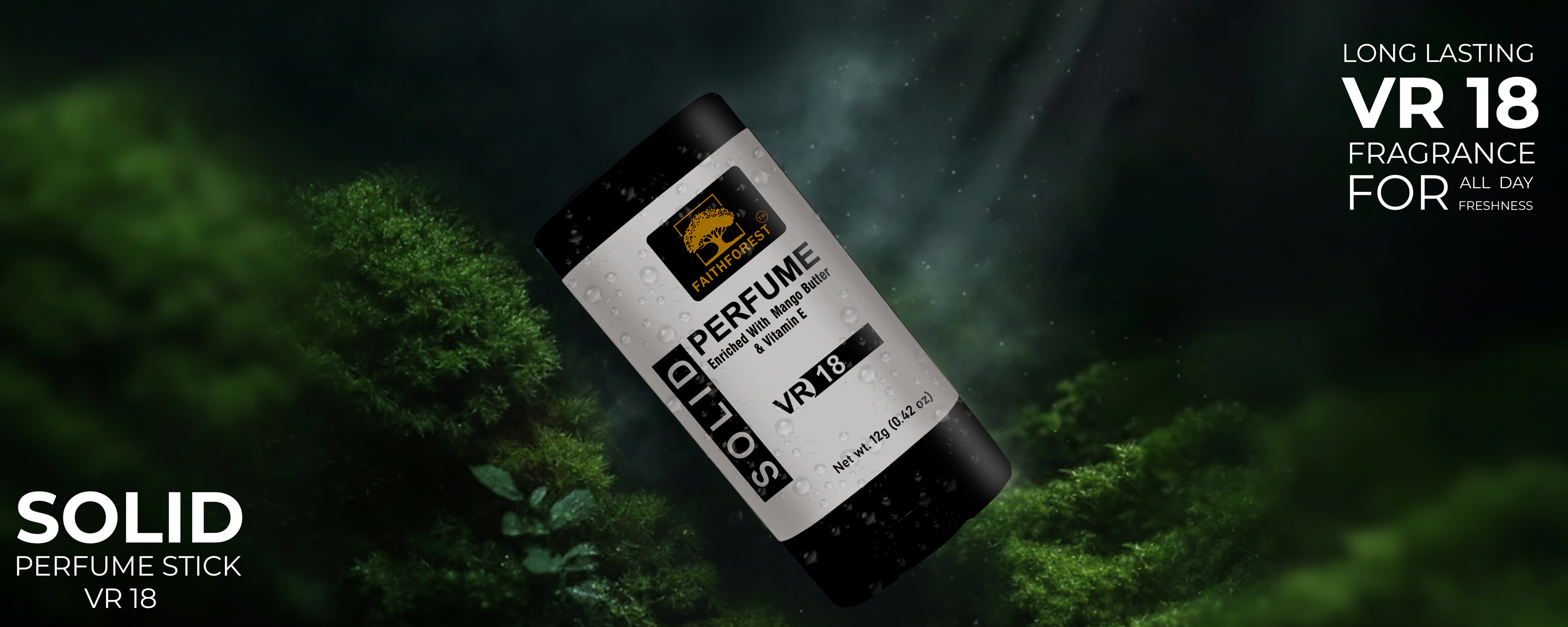 Experience the captivating scent of FaithForest VR 18 Solid Perfume. This 12g alcohol-free stick is enriched with Mango Butter for a smooth, lasting fragrance trail. Portable & spill-proof.Ā